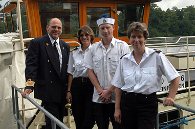 | Auf jeder Fahrt sind mindestens 3 bis 4 fachkundige Personen auf dem Schiff: der Kapitän, ein Matrose und Mitglieder des Catering-Teams. Nach Möglichkeit navigiert Kapitän Ludwig selber, andernfalls zieht er qualifiziertes Personal hinzu. Die Bewirtung wird von Beatrix Ludwig und ihren Mitarbeiterinnen sichergestellt. |